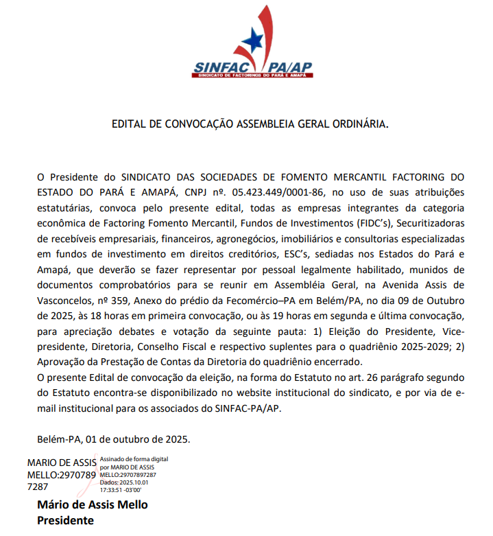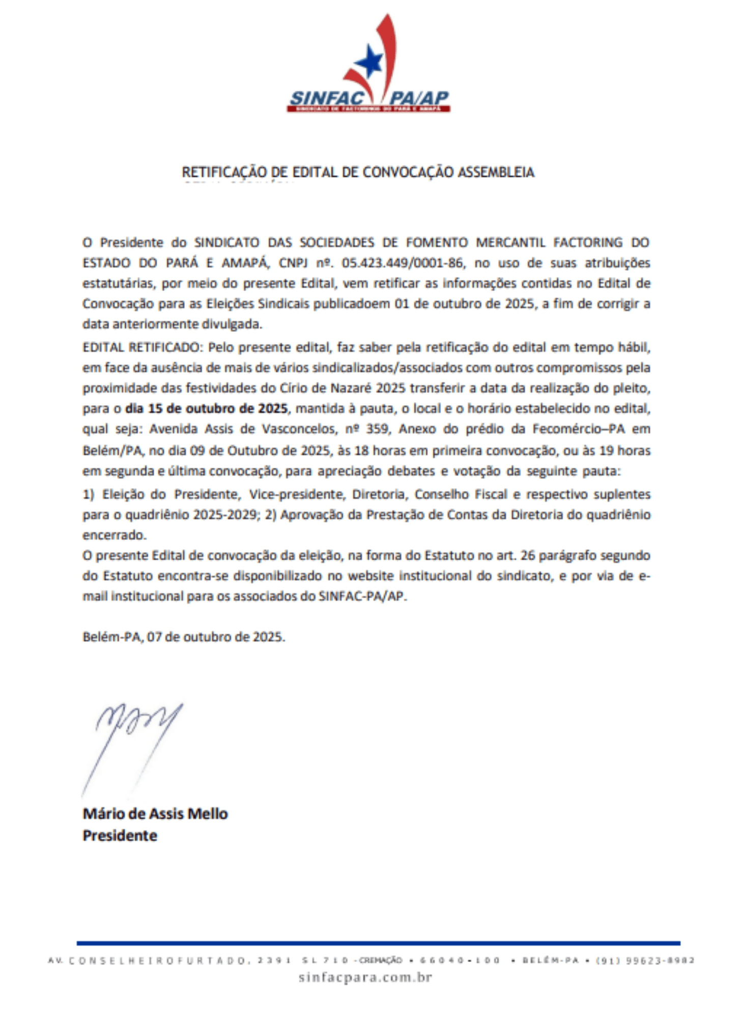 RETIFICAÇÃO DO EDITAL DE CONVOCAÇÃO A.G.O referente a eleição para a mesa Diretora Quadriênio 2025-2029.